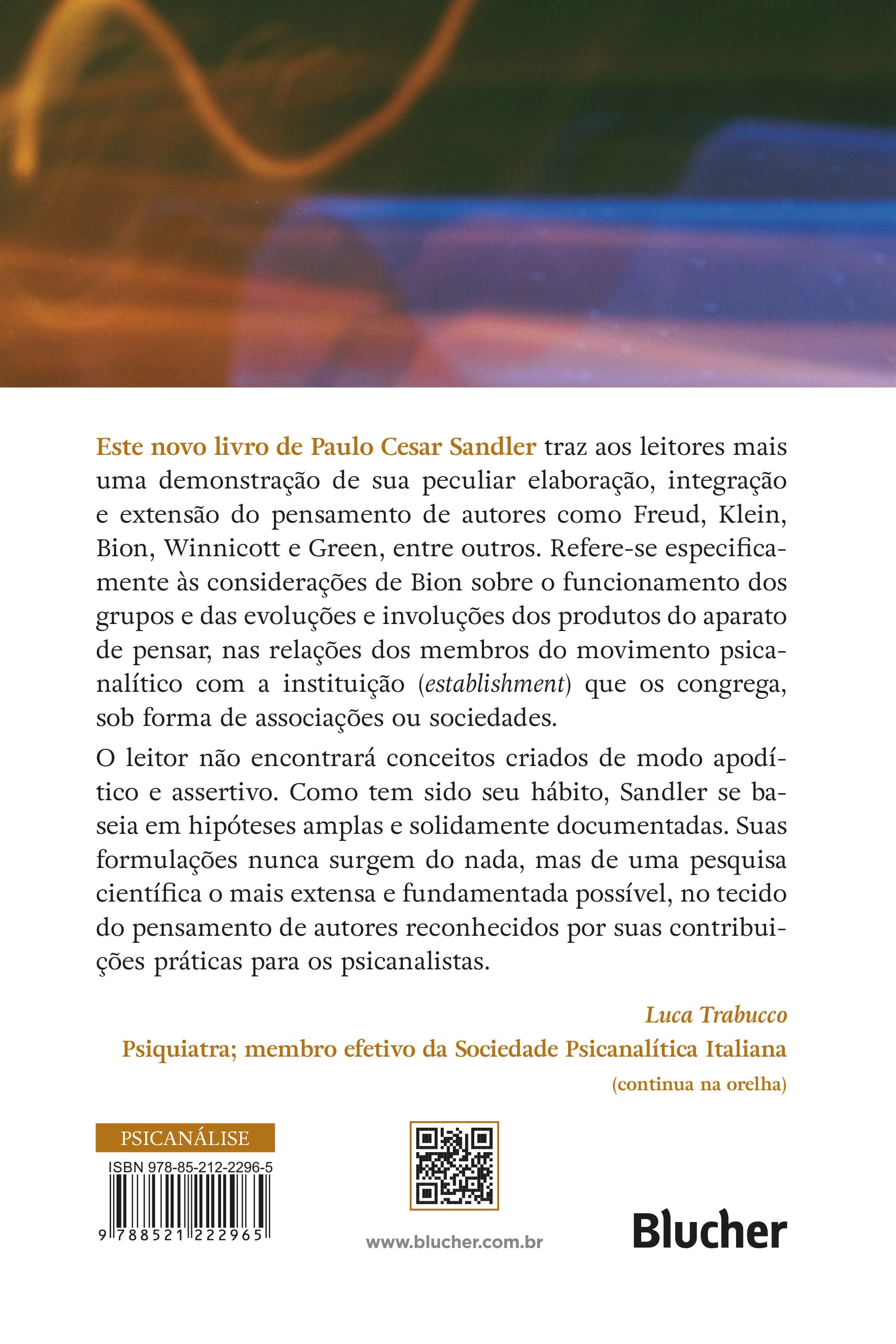 Este novo livro de Paulo Cesar Sandler traz aos leitores mais uma demonstração de sua peculiar elaboração, integração e extensão do pensamento de Freud, Klein, Bion, Winnicott e Green, além das contribuições de outros autores. Refere-se especificamente às considerações de Bion sobre o funcionamento dos grupos e das evoluções e involuções dos produtos do aparato de pensar, nas relações dos membros do movimento psicanalítico com a instituição (establishment) que os congrega, sob forma de associações ou sociedades. O leitor não encontrará conceitos criados de modo apodítico e assertivo. Como tem sido seu hábito, Sandler se baseia em hipóteses amplas e solidamente documentadas. Suas formulações nunca surgem do nada, mas de uma pesquisa científica o mais extensa e fundamentada possível, no tecido do pensamento de autores reconhecidos pelas suas contribuições práticas para os psicanalistas.