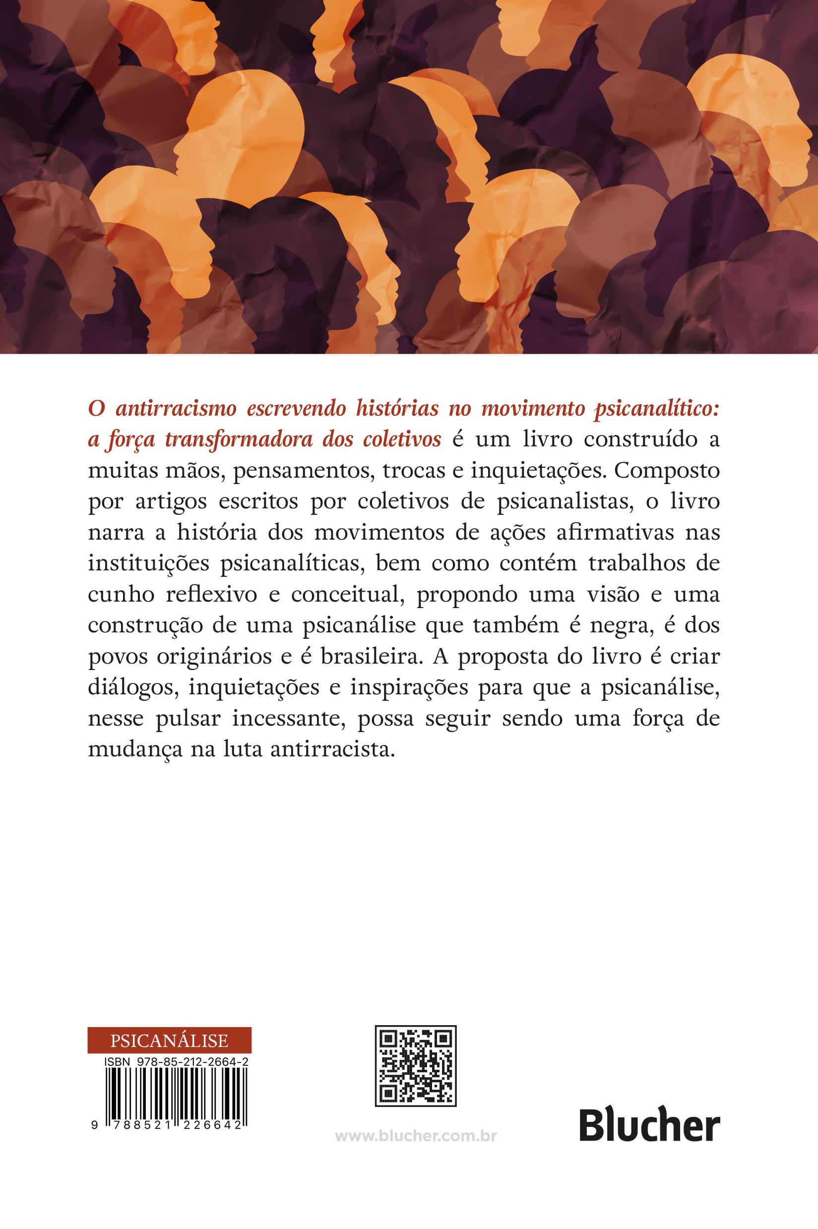 O antirracismo e história no movimento psicanalítico: a força transformadora dos coletivos é um livro construído a muitas mãos, pensamentos, trocas e inquietações. Composto por artigos escritos por coletivos de psicanalistas, o livro narra a história dos movimentos de ações afirmativas nas instituições psicanalíticas, bem como contém trabalhos de cunho reflexivo e conceitual, propondo uma visão e uma construção de uma psicanálise que também é negra, que também é dos povos originários e que também é brasileira. A proposta do livro é poder criar diálogos, inquietações e inspirações para que a psicanálise, nesse pulsar incessante, possa seguir sendo uma força de mudança na luta antirracista.