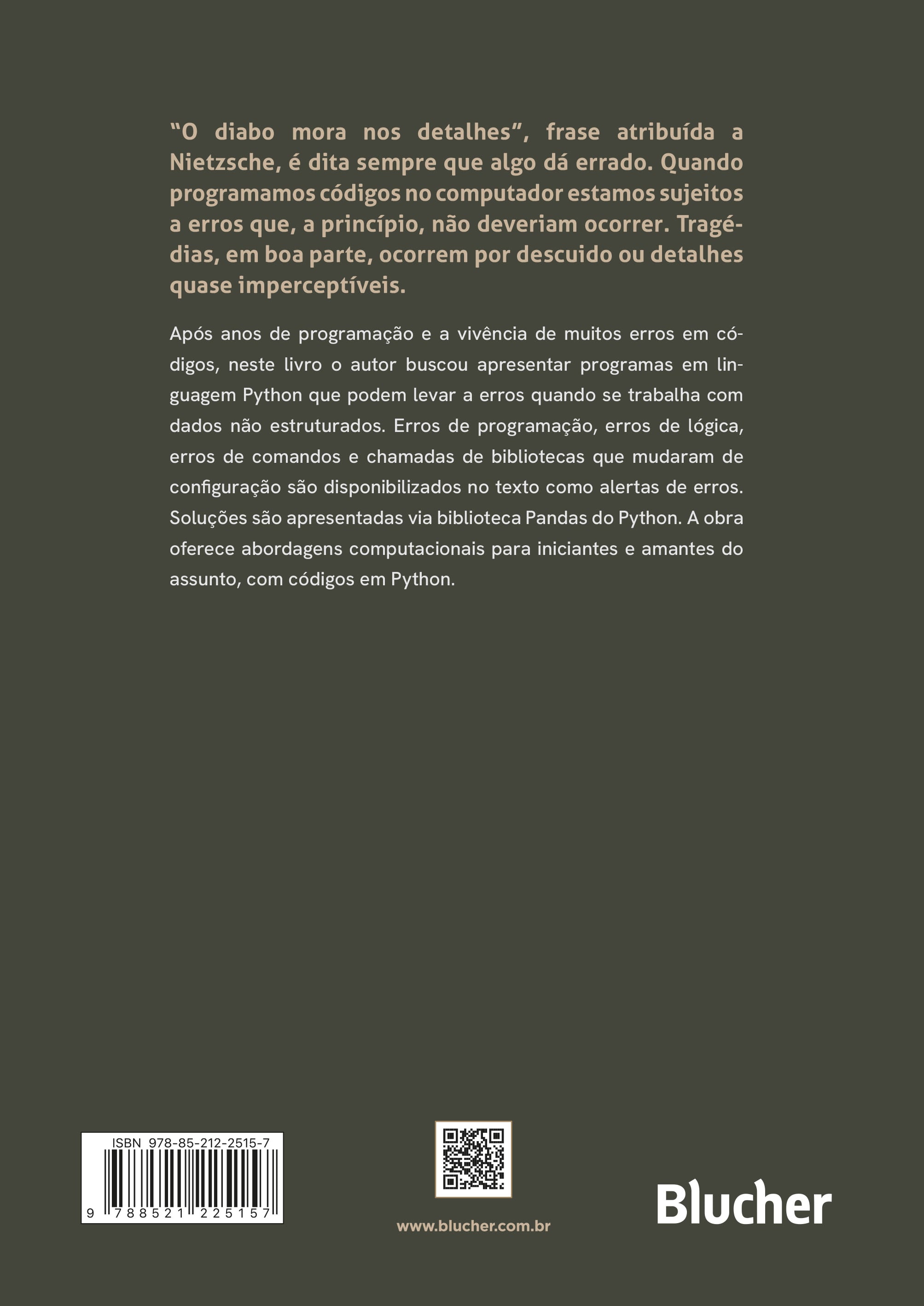 Após anos de programação e a vivência de muitos erros em códigos, neste livro o autor buscou apresentar programas em linguagem Python que podem levar a erros quando se trabalha com dados não estruturados. Erros de programação, erros de lógica, erros de comandos e chamadas de bibliotecas que mudaram de configuração são disponibilizados no texto como alertas de erros. Soluções são apresentadas via biblioteca Pandas do Python. A obra oferece abordagens computacionais para iniciantes e amantes do assunto, com códigos em Python.