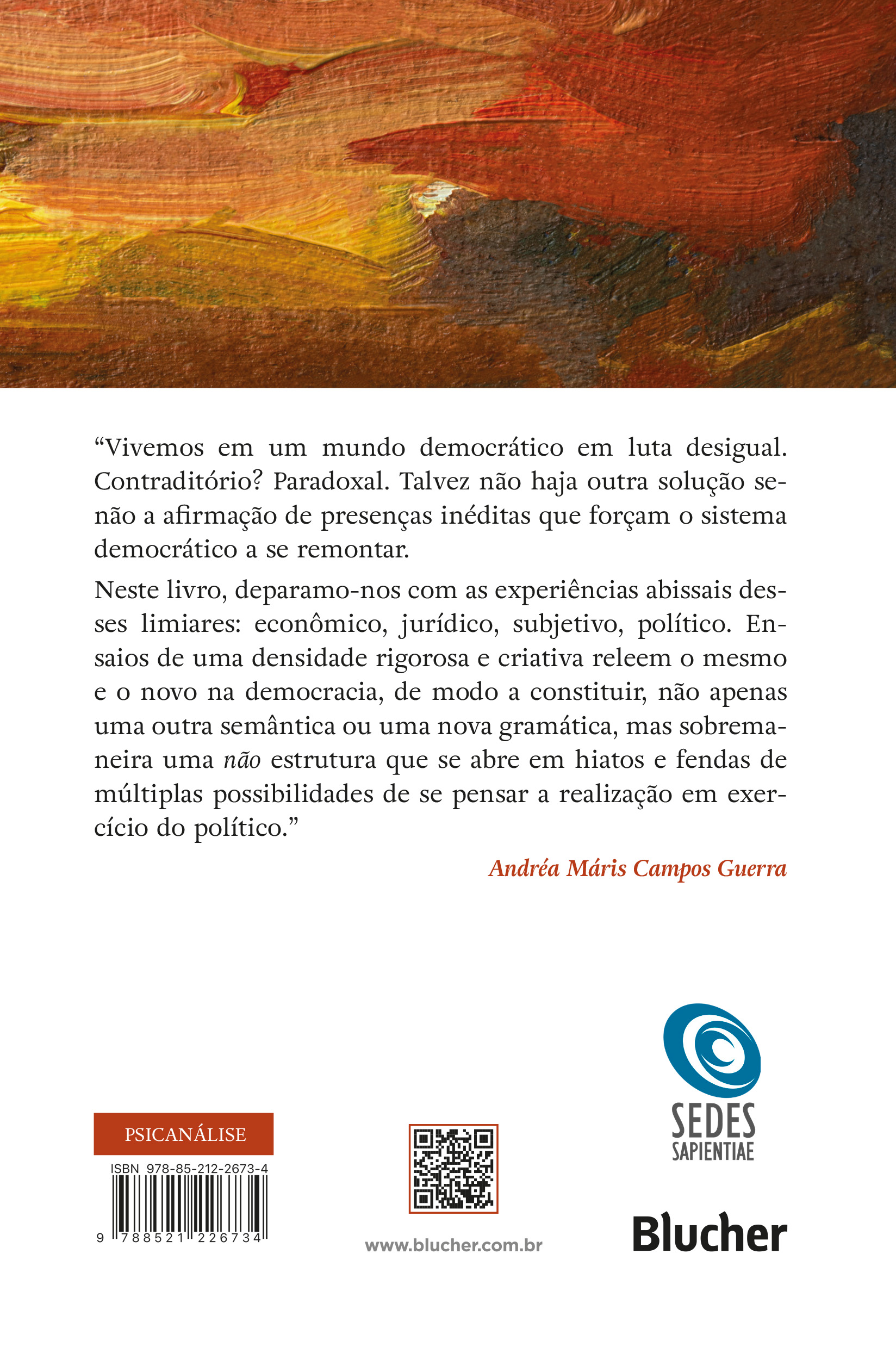 “Vivemos em um mundo democrático em luta desigual. Contraditório? Paradoxal. Talvez não haja outra solução senão a afirmação de presenças inéditas que forçam o sistema democrático a se remontar. Neste livro, deparamo-nos com as experiências abissais desses limiares: econômico, jurídico, subjetivo, político. Ensaios de uma densidade rigorosa e criativa releem o mesmo e o novo na democracia, de modo a constituir, não apenas uma outra semântica ou uma nova gramática, mas sobremaneira uma não estrutura que se abre em hiatos e fendas de múltiplas possibilidades de se pensar a realização em exercício do político.”