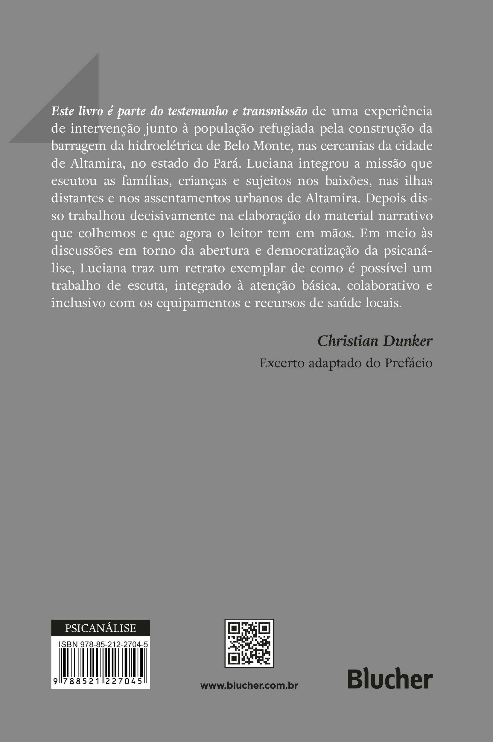 Este livro é parte do testemunho e transmissão de uma experiência de intervenção junto à população refugiada pela construção da barragem da hidroelétrica de Belo Monte, nas cercanias da cidade de Altamira, no estado do Pará. Luciana integrou a missão que escutou as famílias, crianças e sujeitos nos baixões, nas ilhas distantes e nos assentamentos urbanos de Altamira. Depois disso trabalhou decisivamente na elaboração do material narrativo que colhemos e que agora o leitor tem em mãos. Em meio às discussões em torno da abertura e democratização da psicanálise, Luciana traz um retrato exemplar de como é possível um trabalho de escuta, integrado à atenção básica, colaborativo e inclusivo com os equipamentos e recursos de saúde locais.