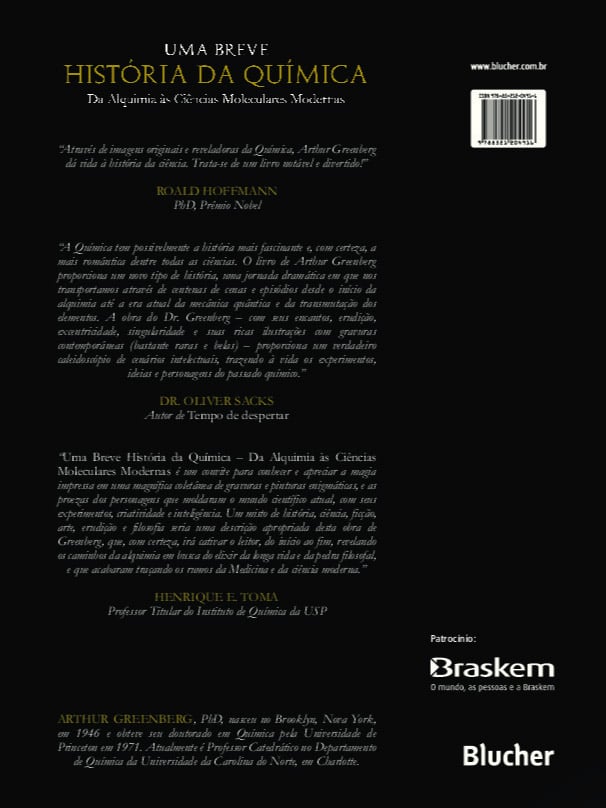 "Uma Breve História da Química - Da Alquimia às Ciências Moleculares Modernas é um convite para conhecer e apreciar a magia impressa em uma magnífica coletânea de gravuras e pinturas enigmáticas, e as proezas dos personagens que moldaram o mundo científico atual, com seus experimentos, criatividade e inteligência. Um misto de história, ciência, ficção, arte, erudição e filosofia seria uma descrição apropriada desta obra de Greenberg, que, com certeza, irá cativar o leitor, do início ao fim, revelando os caminhos da alquimia em busca do elixir da longa vida e da pedra filosofal, e que acabaram traçando os rumos da Medicina e da ciência moderna."