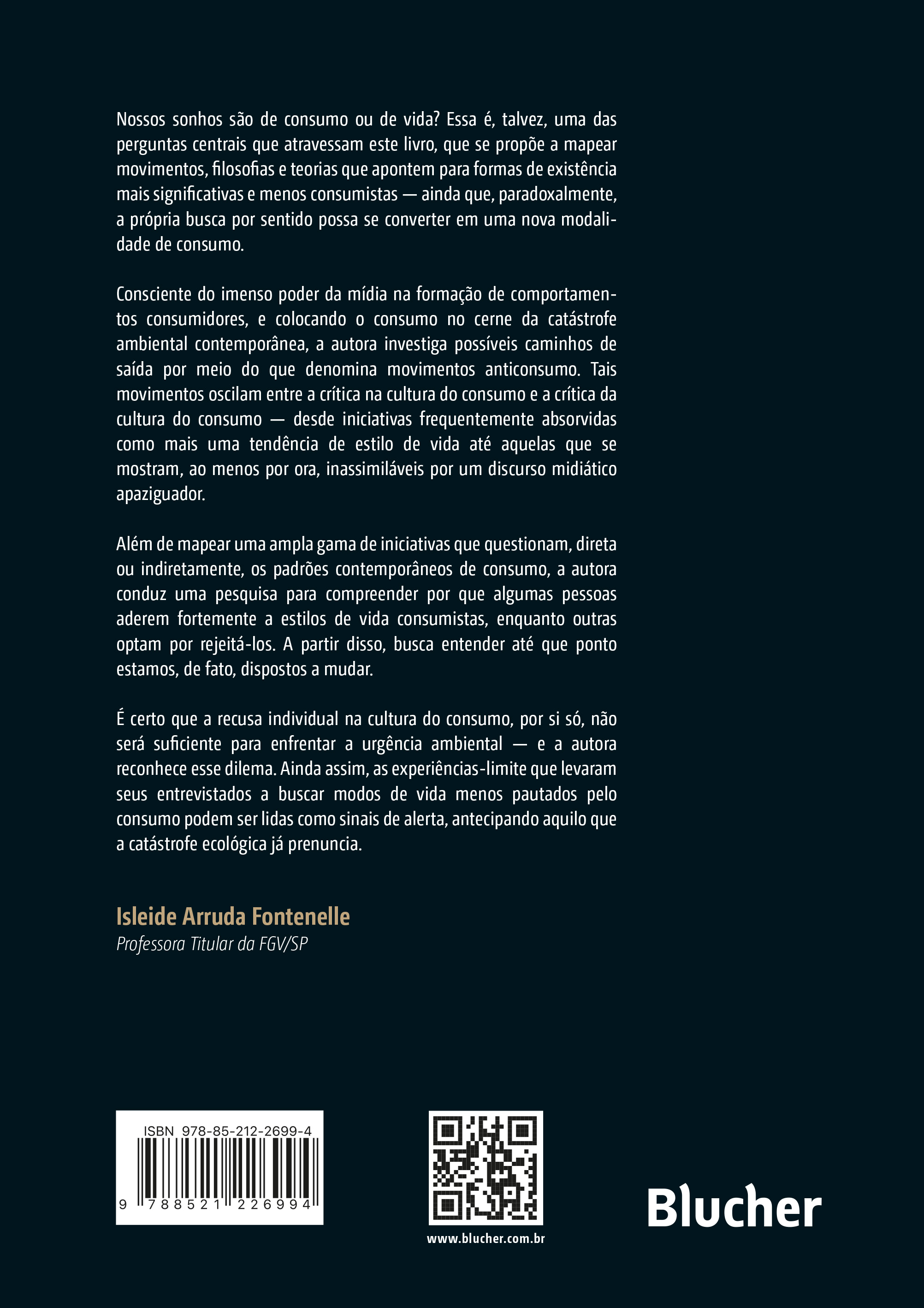 Doutora em Comunicação e Práticas de Consumo pela Escola Superior de Propaganda e Marketing de São Paulo (ESPM-SP). Formada em Design Gráfico, atua por mais de 30 anos na área e tem experiência docente em cursos de graduação em Design Gráfico — lecionou na Belas Artes de São Paulo e na ESPM-SP. Certificada em Design para a Sustentabilidade pelo Gaia Education (líder na educação para a sustentabilidade, práticas regenerativas e desenvolvimento comunitário), atualmente vive na Alemanha e concentra seus estudos no design sustentável, na diminuição do consumo e na desaceleração da vida.